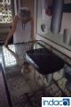 Peggy Guggenheim nella sala d'ingresso di Palazzo Venier dei Leoni, si specchia sulla superficie del tavolo, su cui è posata la scultura di Giacometti, Modello per una piazza (1931-32); alla parete è appeso il dipinto di Hélion, Composizione (Composition) (1935). Venezia, 1975