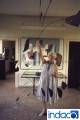 Peggy Guggenheim nella sala d'ingresso di Palazzo Venier dei Leoni, tiene tra le dita Arco di petali di Calder (1941). Sul tavolo alle sue spalle è posata la scultura di Giacometti, Modello per una piazza (1931-32), alla parete è appeso il dipinto di Hélion, Composizione (Composition) (1935). Sullo sfondo si riconosce la scultura di Pevsner Superficie sviluppabile (1938-39). Venezia, 1975