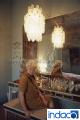 Peggy Guggenheim posa seduta al tavolo da toletta, nella sua camera da letto a Palazzo Venier dei Leoni.. Venezia, 1975.
